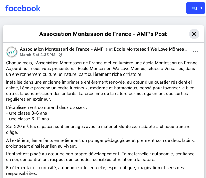 Nous sommes ravis de partager que notre école Montessori Versailles a été mise en lumière ce mois-ci par l’Association Montessori de France ! L’article présente notre approche Montessori, nos projets pédagogiques, le lien avec la nature et le quotidien des enfants. C’est un vrai plaisir de voir le travail de toute notre équipe reconnu et valorisé. Association Montessori Internationale (AMI) Un grand merci à l’AMF pour cette mise en avant ! Vous trouverez ci-dessous l'intégralité du message.