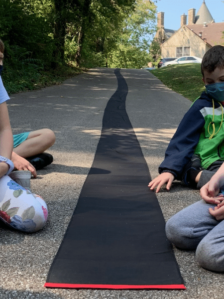 À la rentrée scolaire 2022, nous avons présenté le grand récit sur la création de l’univers, connu sous le nom du « Ruban Noir ». Ce récit commence avec une longue bande noire (de 45 mètres !) et se termine par une fine largeur de 1 cm en rouge. Ce matériel représente le temps (en noir) avant l’apparition de la vie (en rouge). Sur le ruban noir peuvent se parer différentes couleurs illustrant les étapes de la formation de l’univers, de la Terre, de la vie sur la Terre, de l’Homme.